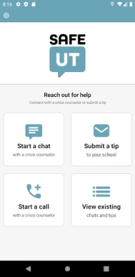 The SafeUT Crisis Text and Tip Line app provides 24/7 access to crisis counseling and school tip reporting for students and their parents and guardians that live in the state of Utah. After installing the app you can connect directly to the UNI CrisisLine or report a confidential tip on bullying, school threats of violence or concern about someone in crisis. CrisisLine staff can assist with a wide variety of problems, including emotional crisis, grief and loss, drug and alcohol problems, mental health issues, self-harm and suicidal behavior.