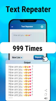Text Repeater app is a game-changing solution for repetitive messaging. Repeat your text as many times as you want with the Text Repeater. Repeat a message or a phrase multiple times, easily copy your repeated text to the clipboard, and share it directly with your contacts via messaging apps or social media platforms with the Text Repeater app. Make repeated letters using the alphabet and emoji characters, and watch as your messages come alive with Text Repeater one by one.